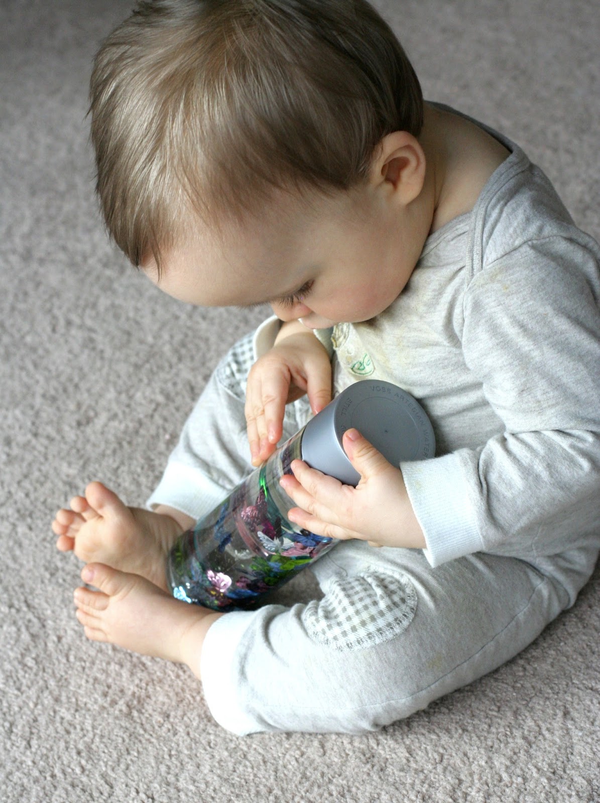 Baby X loves to explore things. He's very methodical and will spend a lot of time quietly inspecting, so I knew that Discovery Bottles would be a big hit for him. Discovery Bottles are a great way for a baby or a toddler to safely explore materials that might be a choking hazard (or otherwise unsafe for little ones). And as a bonus, we find that Discovery Bottles make great decorations! You can see our Discovery Bottles on display in our Playroom here. :)