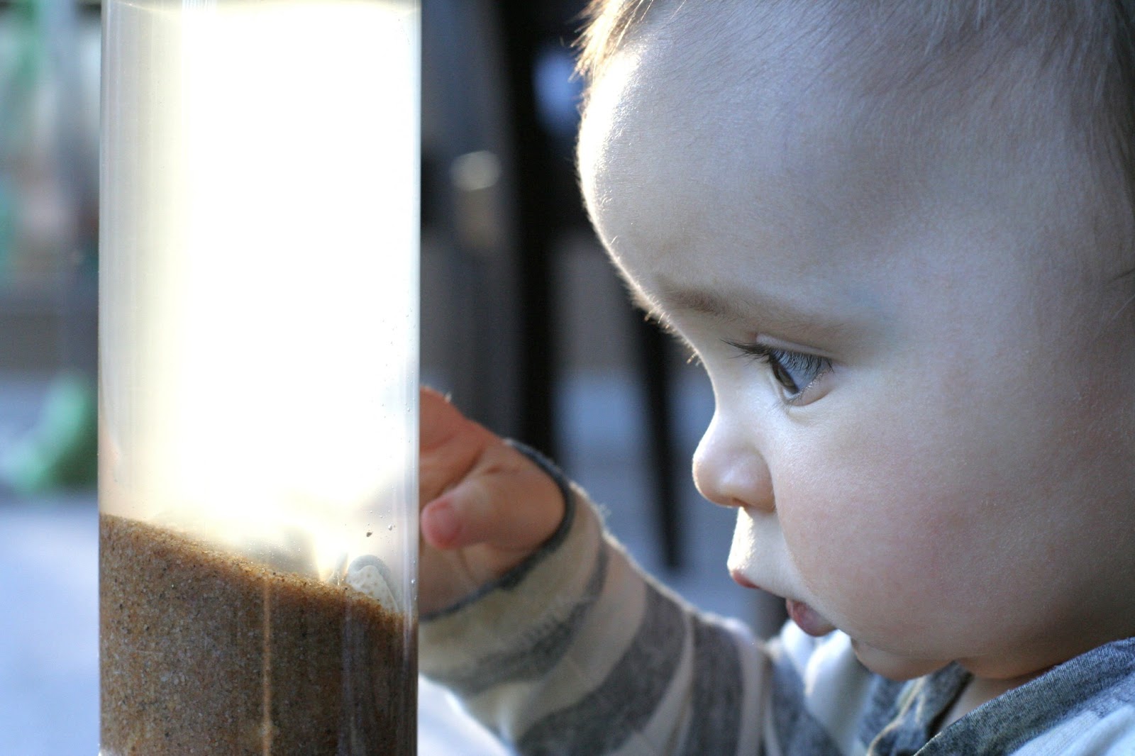 I just love this photo - he really does concentrate and notice all the little details in the bottles. The shells make a really soft clinking noise as you roll the bottle, and of course if you shake it up, it's fun to watch the shells and sand settle to the bottom as he's doing here.