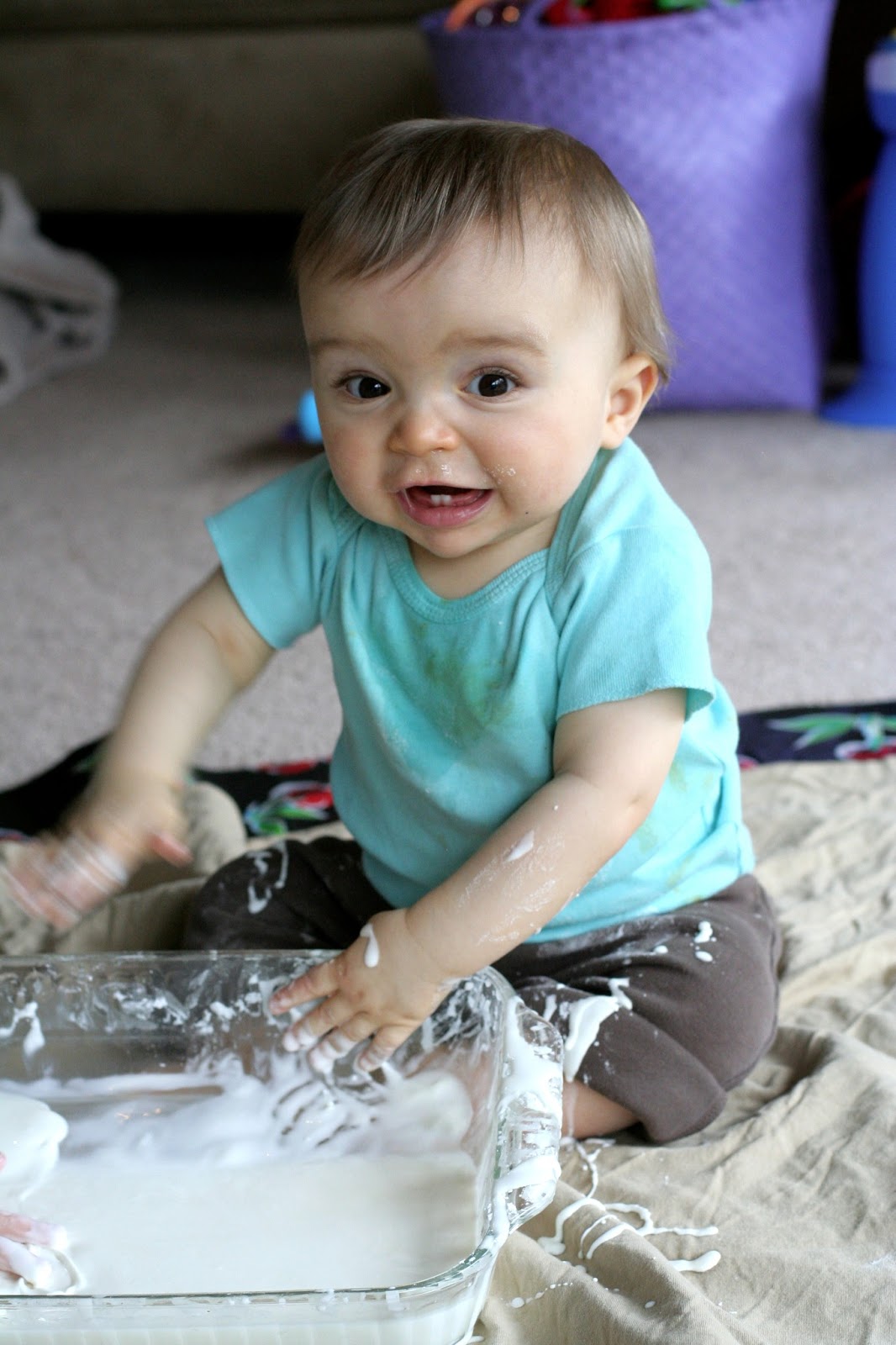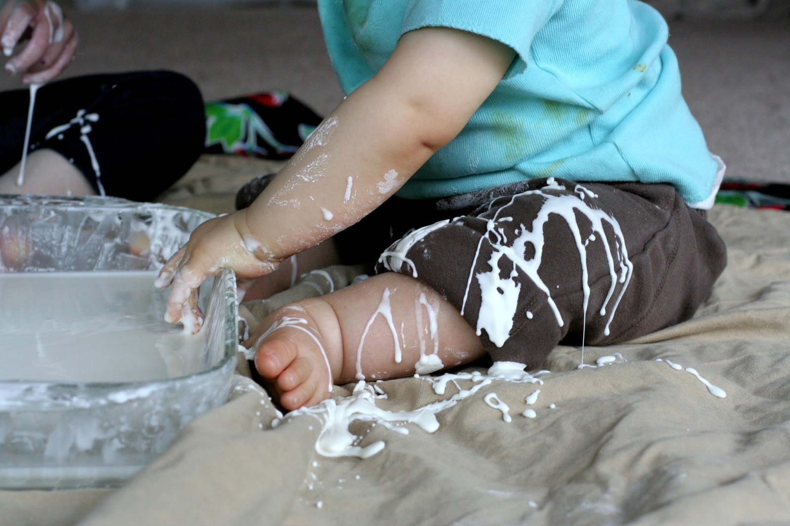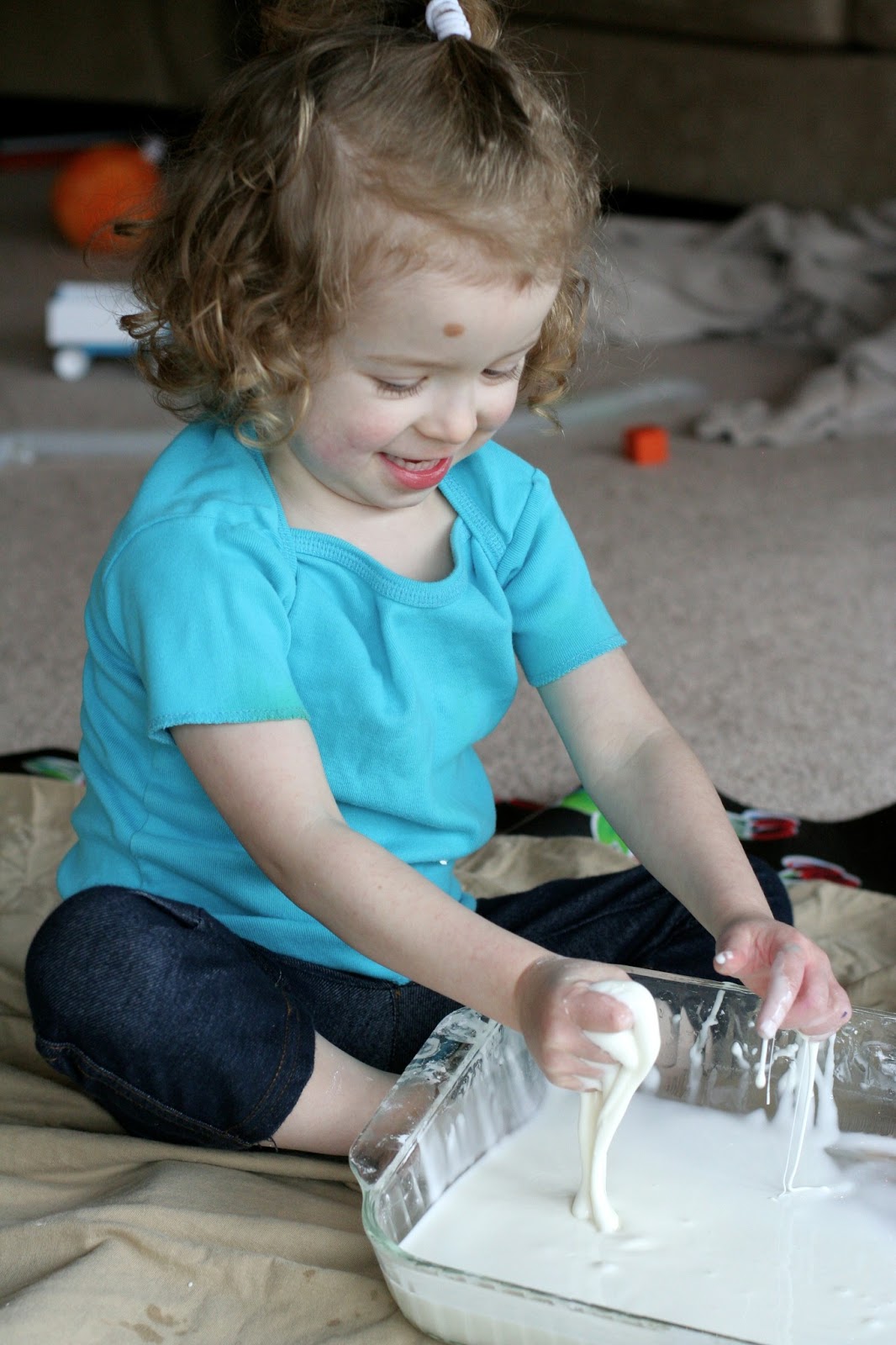 So you may have noticed that the kids are sitting on a sheet...that's because this gets messy.  Really messy.  It's totally cleanable, but it will get everywhere if your kids are playing with it.  You can totally do this play in an empty bathtub if you'd like it easily contained (and then easily transition into baths!).  Setting out a sheet works really well for us; afterwards I just throw it and the kids' clothes in the washing machine and we're good.  You could just play with it on the splat mat, but it can be a bit obnoxious to clean when it's wet (if you had a place to let it dry out first, you could totally just vacuum it off the splat mat, though).